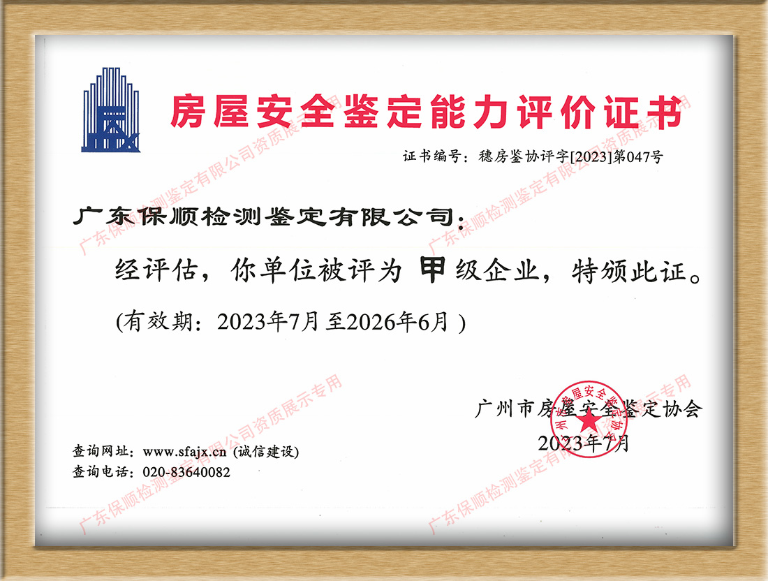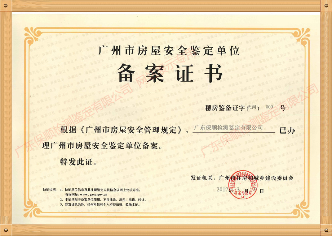 廣東保順檢測鑒定有限公司創辦于2004年,具有建設工程質量檢測機構資質、國家CMA/CNAS認可資質,以及住建委房屋檢測鑒定資質備案的甲級房屋鑒定機構,已通過ISO9001質量管理體系及高新技術企業認證。已入廣東、廣西、海南、湖南、湖北、四川、貴州、云南等省高級人民法院及各地區中院房屋鑒定機構名冊,受理各類司法仲裁糾紛案例8000余宗。?