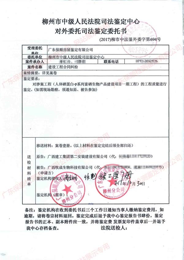 廣西柳州市中級人民法院司法鑒定中心建筑工程質(zhì)量司法鑒定 - 廣東保順檢測鑒定有限公司