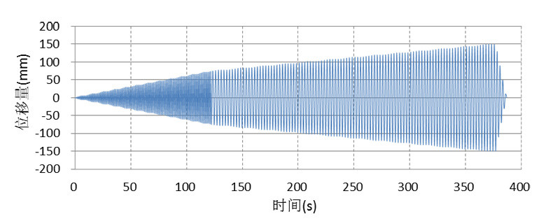 8.1 檢測加載順序如圖2所示。整個檢測過程由“增強”階段和“等振幅”階段兩個階段交替組成。兩個相鄰“等振幅”階段的位移量之差應為±6mm,每個“增強”階段和“等振幅”階段均由4個正弦周期組成。當位移量不大于±75mm時,檢測的頻率應為0.8(+0.1,0.0)Hz ;位移量大于±75mm時,檢測的頻率應為0.4(+0.1,0.0)Hz。