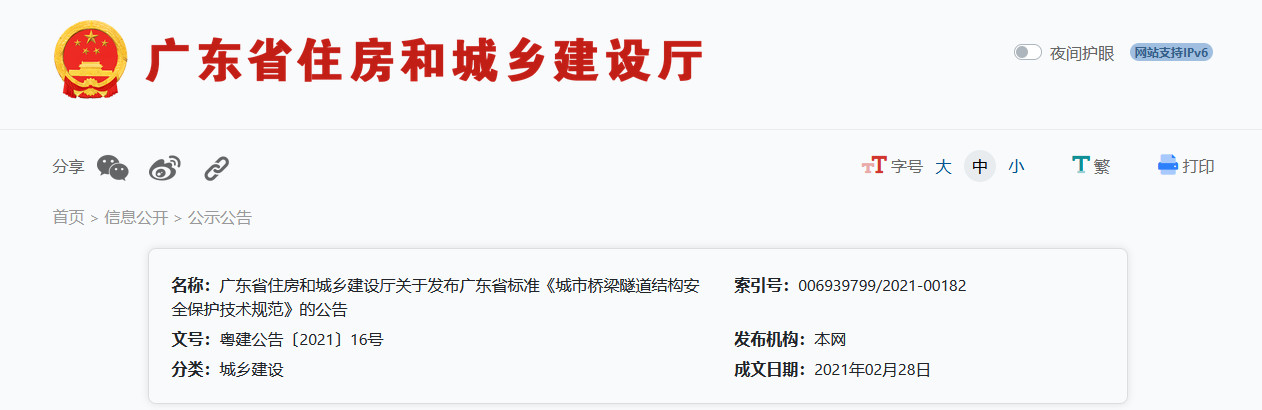 通知廣東省住房和城鄉(xiāng)建設廳關于發(fā)布廣東省標準《城市橋梁隧道結構安全保護技術規(guī)范》的公告