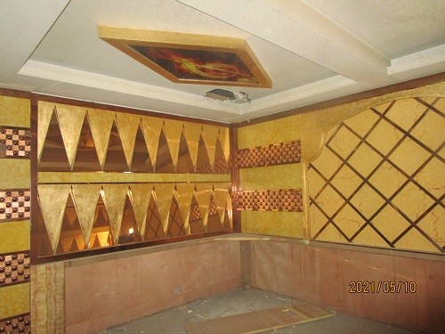 該房屋外墻飾面為混合砂漿抹灰掃白;內墻飾面為裝飾板;天花為吊頂;室內地面為瓷磚;門為玻璃門、木門,窗為鐵窗。該房屋屋面形式為上人屋面。該房屋曾作為KTV用途使用,現已閑置。據悉該房屋建于2006年,該房屋內景如下照片所示: